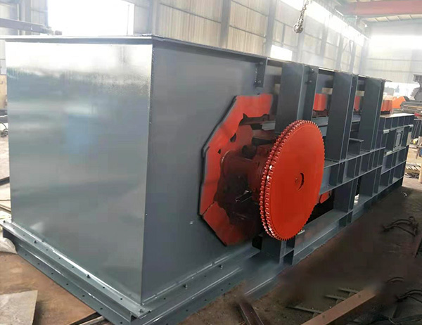 鏈闆式喂料機採(cǎi)用節距爲228.6mm(9吋)的高強度推土機模鍛鏈條爲牽引件,兩根鏈條繞過安裝在機體頭部的一對驅動鏈輪和機體尾部的一對張緊輪聯成封閉形回路,在兩排鏈條的每個鏈節上裝配瞭(le)相互交疊的、重型結構的輸送槽而成爲一個連續的能夠運載物料的輸送線路。其自重和物料的重量由安裝在機體上的多排支重輪、鏈托輪和滑道梁支承。傳動系統經交流變頻調速電動機聯接減速機,再由漲套與驅動裝置直聯驅動運載機構低速運行。将尾部料倉卸入的物料沿輸送線路運至機體的前方排出,實現向下方的工作機械連續均勻喂料的目的。