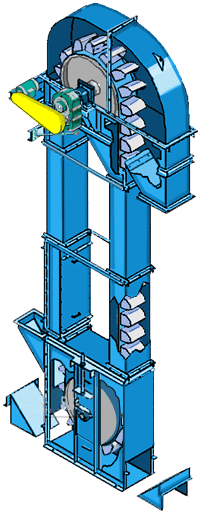 TB系列垂直鬥式提升機啓動後,料鬥把物料從下面的儲(chǔ)藏中舀起,随著(zhe)輸送鏈提升到頂部,繞過頂輪後向下翻轉,然後将物料傾入接受槽内。